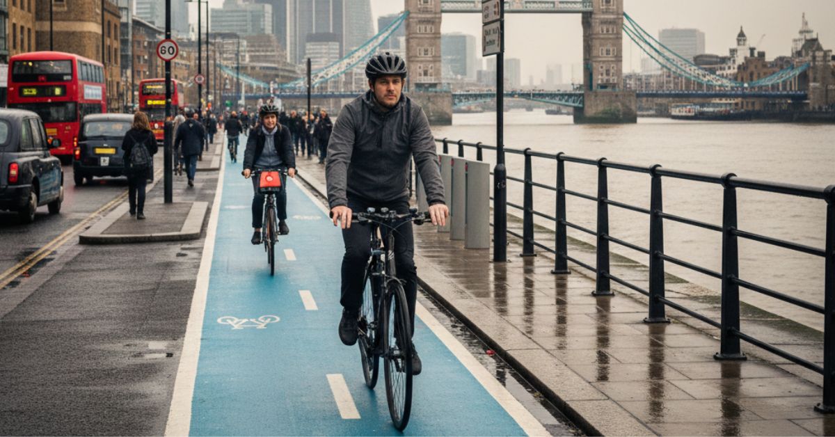 As you continue west, landmarks begin to appear more frequently. The outline of Tower Bridge becomes visible in the distance, and the river narrows slightly, drawing you toward central London. Riding near Tower Bridge is often a highlight. The bridge itself feels theatrical, especially when approached by bike. The blue suspension elements and stone towers frame the road in a way that makes you instinctively slow down and look around. Tourists gather with cameras, boats pass beneath, and for a moment, you feel woven into a classic London scene. Beyond this point, the city grows denser. The financial district around Bank and Monument brings busier streets and a sharper pace. Dedicated cycle lanes help, but awareness is key. Buses, black cabs, and delivery vans all share the space. Still, there’s an undeniable thrill in navigating through it all. Every junction feels like a small victory. You’re not just observing London; you’re participating in it.