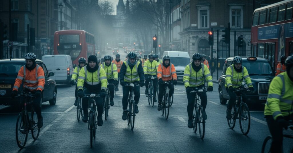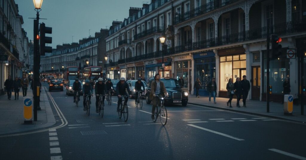 Morning in London begins before the sun has fully committed. Cyclists appear in layers, wrapped in hi vis, scarves, and half awake determination. The air is sharp, and the streets hum with purpose. Everyone is going somewhere important, and they are already slightly late. Traffic lights feel more aggressive in the morning. Red lights linger longer, greens vanish too quickly. Buses exhale clouds of diesel as they pull away from stops, taxis dart into gaps that barely exist, and delivery vans perform questionable manoeuvres that make you question your faith in mirrors. You pedal with intention, eyes scanning constantly, body tense but alert. This is not the time for daydreaming. There is a silent camaraderie among morning cyclists. You may not speak, but you notice each other. A nod at the lights. A shared eye roll at a blocked cycle lane. A small, unspoken agreement that you’re all enduring the same madness together. You ride defensively, predictively, always ready for the unexpected opening door or sudden turn.